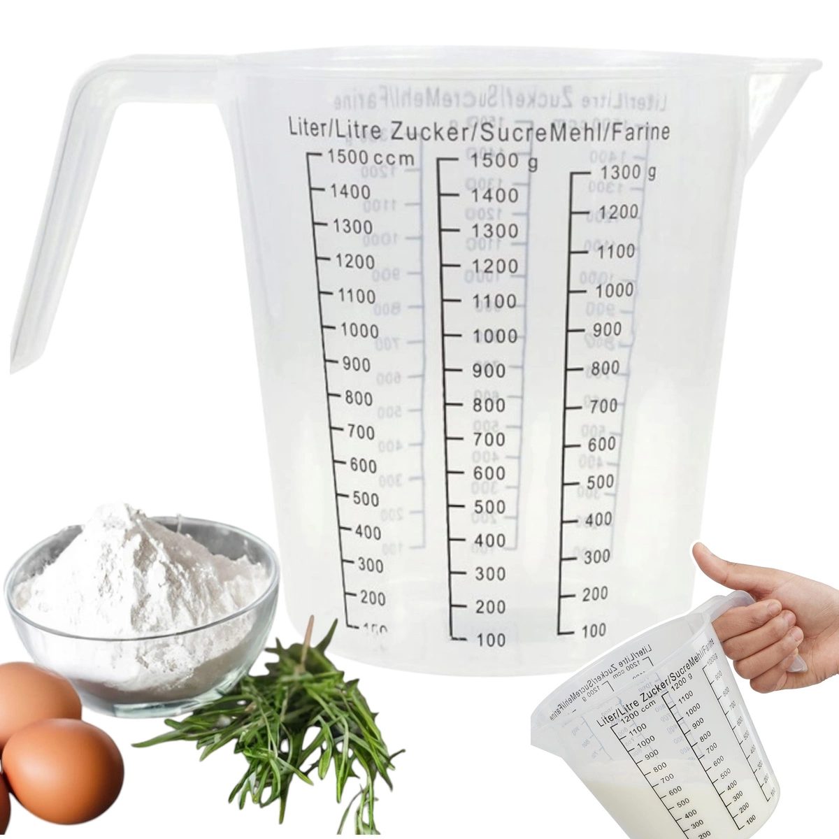 - Pojemność 1,5 litra zapewnia odpowiednią ilość miejsca do odmierzania większych ilości składników, dzięki czemu nie musisz używać kilku miarek podczas jednego przepisu.