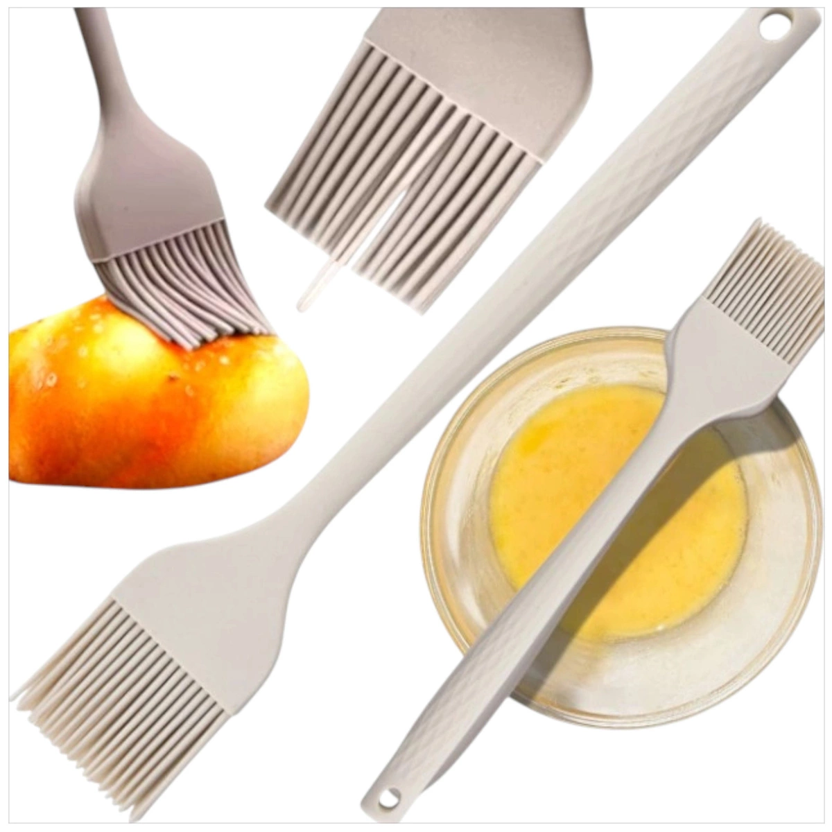 - Pędzelek silikonowy jest odporny na wysokie temperatury, dzięki czemu możesz używać go zarówno podczas pieczenia, jak i smażenia bez obaw o uszkodzenie.