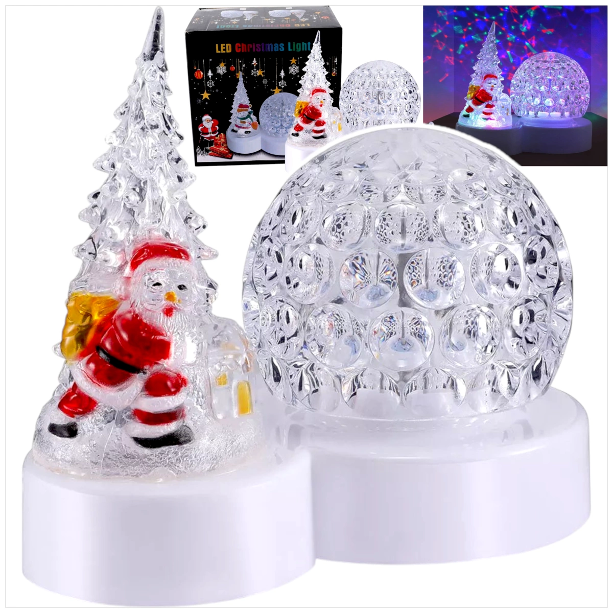 Świąteczna Dekoracja LED – Mikołaj z Choinką + Kryształowa Kula Projektor | Lampka Bożonarodzeniowa z Efektem Świateł