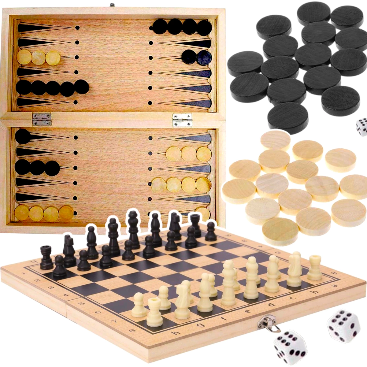 KLASYCZNE SZACHY DREWNIANE SKŁADANE 3w1 WARCABY TRYKTRAK KOSTKI DLA DZIECI
